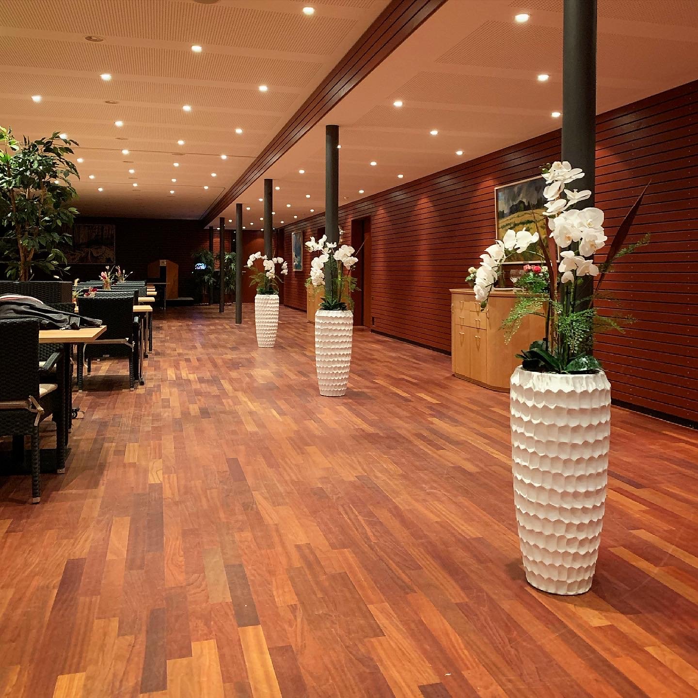 Aufgrund der grossen Fensterfronten, gingen die Echtpflanzen immer ein. Wir durften die bestehenden Gefässe mit schönen Kunstorchideen gestalten.