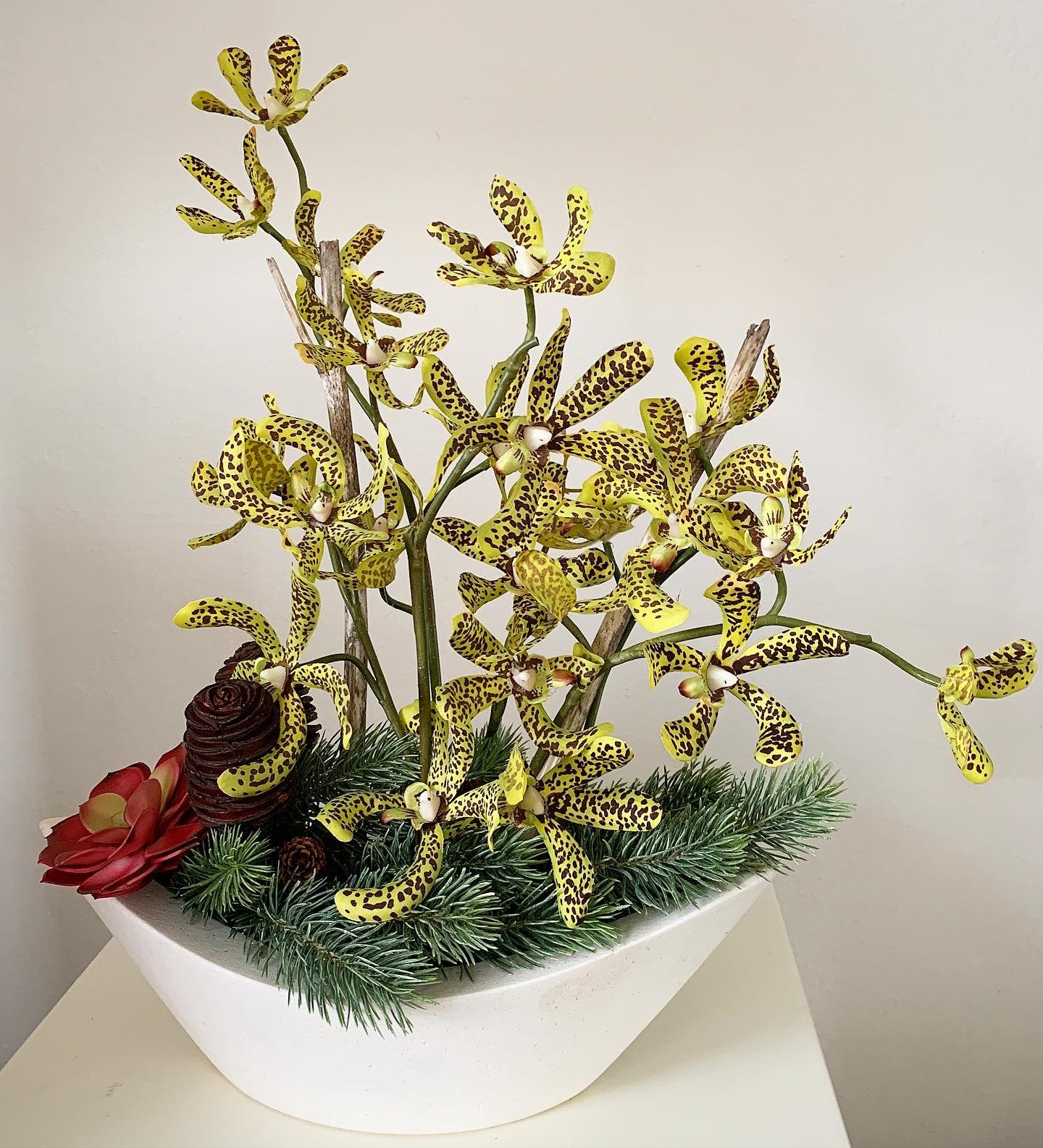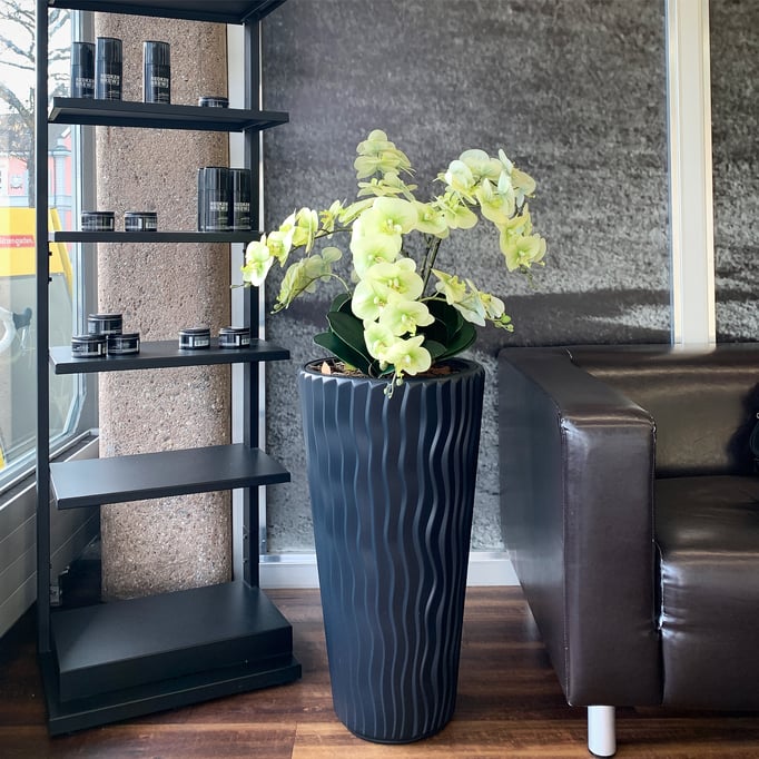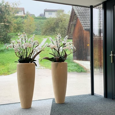 Unser Kunde hatte genug davon die Orchideen ständig zu ersetzen und zu pflegen. Aus diesem Grund hat er sich für ein langlebige Variante entschieden. Die Gefässe wurden von ihm ausgesucht und mitgebracht. Wir durften diese farblich passend arrangieren. Das Resultat kann sich sehen lassen.